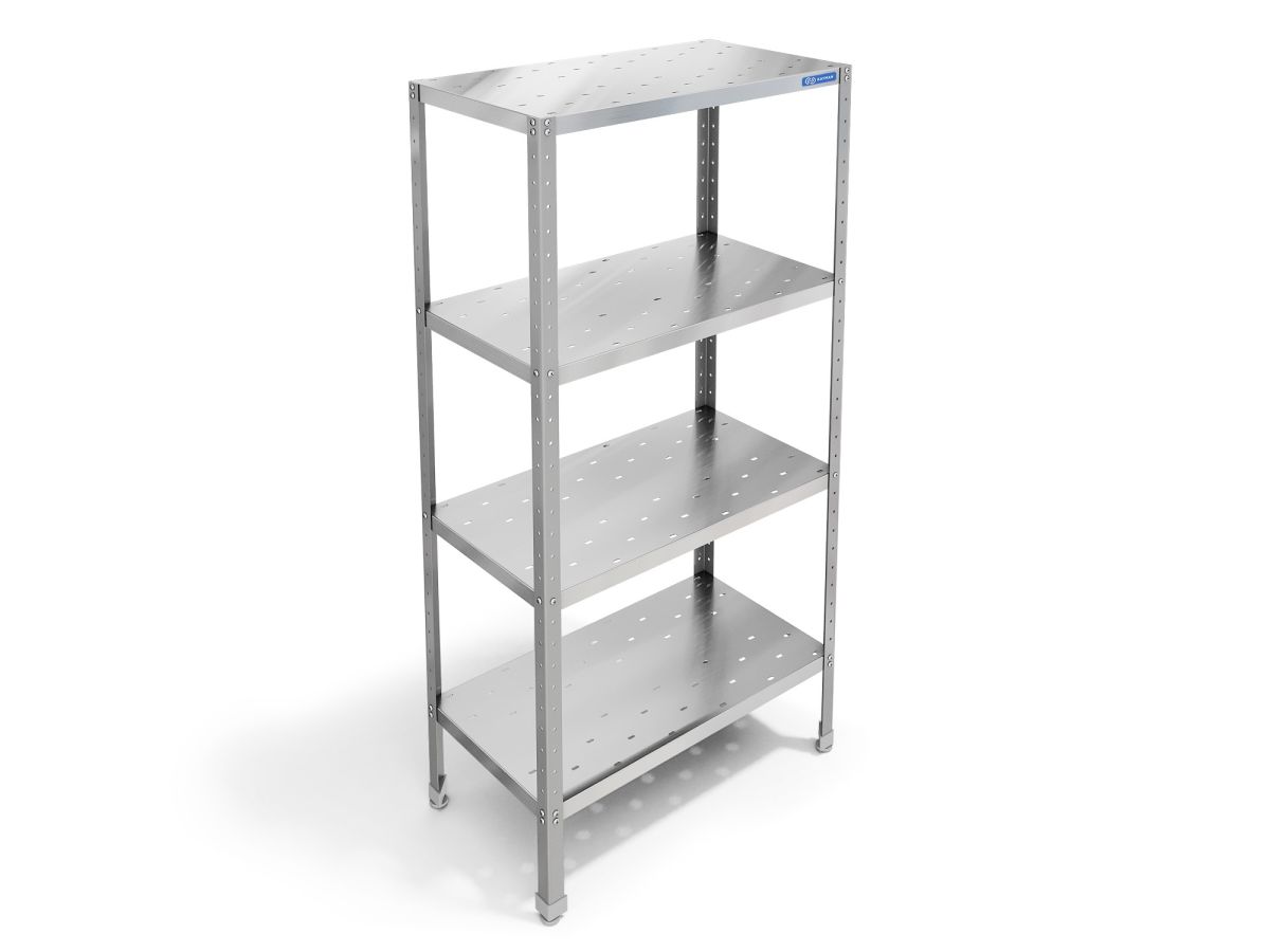900х400х1820, аркас разборный, стойки уголок 40х40 из нержавеющей стали AISI 430, толщиной 1,5 мм, 4 перфорированные полки из стали AISI 430, толщиной 0,8 мм 0,07V, м3 Нагрузка на одну полку- 70 кг- равнораспределенная.