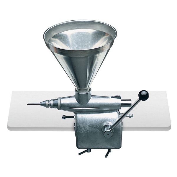 Предназначена для отсадки начинок из шоколада, меда, джема и заварного крема в изделия. Не подходит для масляного крема и взбитых сливок. Крепится к столу. Комплектуется бункером-воронкой на 6,5 л и тремя сменными трубками. Диапазон от 1 до 60гр. Габариты 370*520*380мм. Алюминиевый корпус, с поршенем из нержавеющей стали, воронкой, соплами и поршнем из нержавеющей стали AISI 304 - бункер объемом 7 литров (в комплекте 3 форсунки + клапан + прокладка + гаечный ключ)