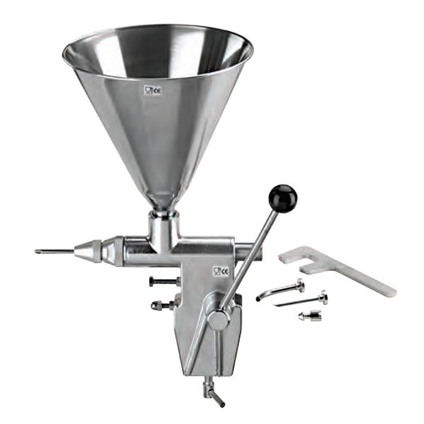 Предназначена для отсадки начинок из шоколада, меда, джема и заварного крема в изделия. Не подходит для масляного крема и взбитых сливок. Крепится к столу. Комплектуется бункером-воронкой на 3л и тремя сменными трубками. Диапазон от 1 до 12гр. Габариты 250*440*200мм. с поршнем из нержавеющей стали - бункер объемом 3 литра (в комплекте 3 форсунки + клапан + прокладка + гаечный ключ)