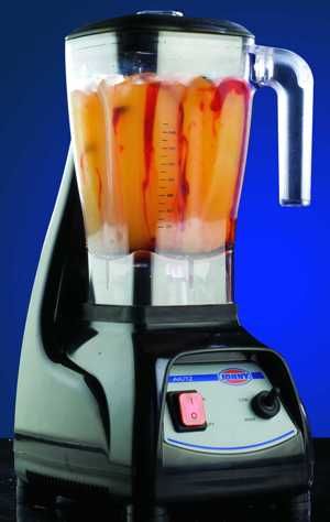 180х245х450 мм, 4,66 кг, 220 В, 1,2 кВт, корпус - пластик. цвет черный, стакан - пластик. объем стакана - 2,5 л, мотор - 12.000/22.000 об/мин. 2 скорости. нож из нержавеющей стали толщиной 2,5 мм, пригодный для рубки льда; сцепление контейнера с приводом - резионвое снаружи, стальное внутри