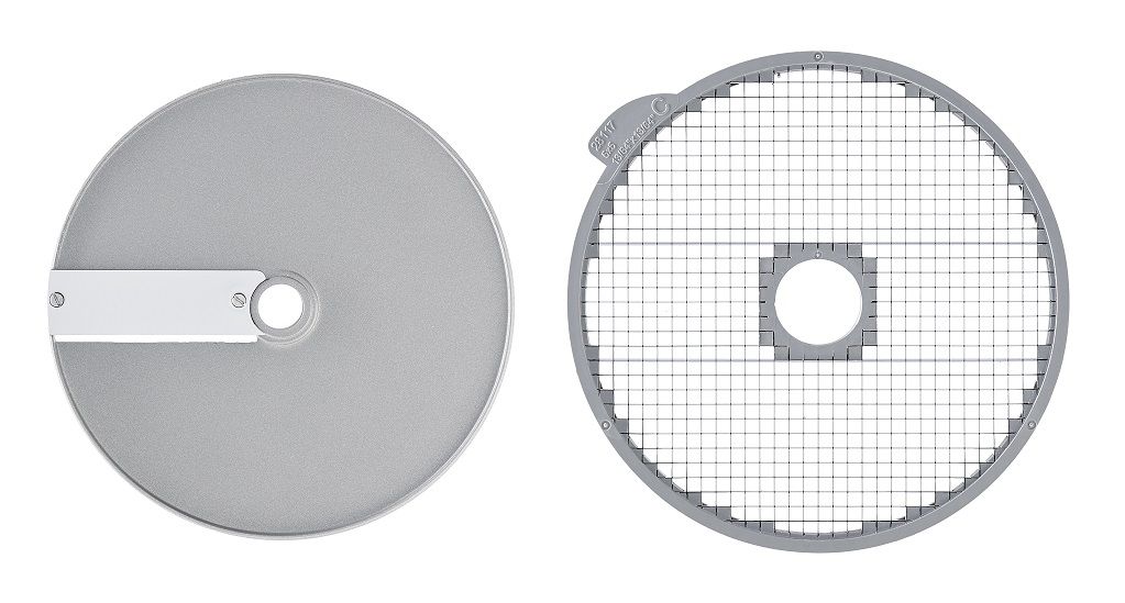 комплект 28110W: диск 28128W + решетка 28117, Устанавливается в рабочий отсек овощерезки на вал двигателя, используется для моделей CL50, CL50 Ultra, CL50 Gourmet, CL52, CL55, CL60,, CL60 V.V., R502, R502 V.V., R752, R752 V.V., изготовлен из алюминия с покрытием Mineral+. Используется для нарезки моркови, кабачков, огурцов, сельдерея на кубики размером 5х5х5 мм.