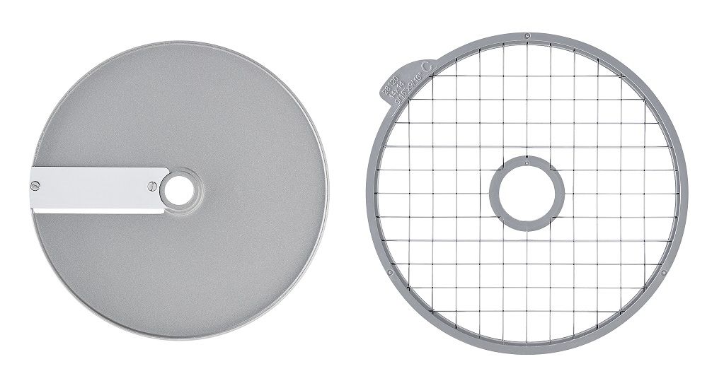rкомплект: диск-слайсер + решётка; Устанавливается в рабочий отсек овощерезки на вал двигателя, используется для моделей CL50, CL50 Ultra, CL50 Gourmet, CL52, CL55, CL60, CL60 V.V., R502, R502 V.V., R752, R752 V.V., изготовлен из алюминия с покрытием Mineral+. Используется для нарезки на кубики