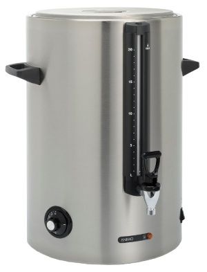 355x355x515 мм без ручек, с ручками d 446 мм, 3,2 кВт, 220В, настольный, ЗАЛИВНОЙ, с встроенным указателем уровня воды, высококачественная нержавеющая сталь CrNi 18-9, с двойными стенками для дополнительной надёжности; ёмкость 20 л, за один раз проливает 18 л, производительность в час: 240 чашек, 30 литров; время нагрева за 34 мин. с 20 до 97 C, регулируемая температура от 0 до +97C, защита от работы в сухую