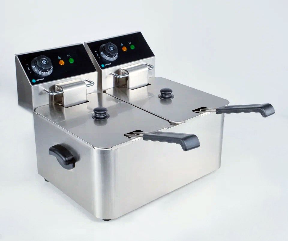 490x380x320мм, 4кВт, 220В, 9,2кг, 2 ванны емкостью 4 л с крышками, 2 фритюрные корзины, температурный режим 60-200 С, размер корзины (без ручки) 210x140x115мм