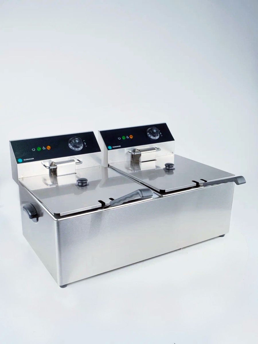 538x415x345мм, 6,5кВт, 220В, 11кг, 2 ванны емкостью 8 л с крышками, 2 фритюрные корзины, температурный режим 60-200 С, размер корзины (без ручки) 234x186x146мм