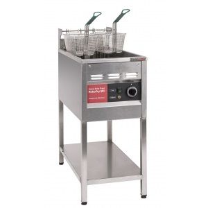 400х900х1050мм, Фритюрница электрическая на открытом стенде с одной ванной объёмом 25л. Имеет холодную зону 1,7л для сгоревших частичек продуктов. Электро-механическая система управления. Регулятор температуры расположен на фронтальной части фритюрницы.