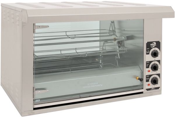 1030*650*580мм, Гриль для кур электрический карусельный, 1 камера, загрузка 12 кур, нерж.сталь, электромех.управление, крыша с подсветкой. В комплекте вертел съемный, 4 люльки-корзины, поддон
