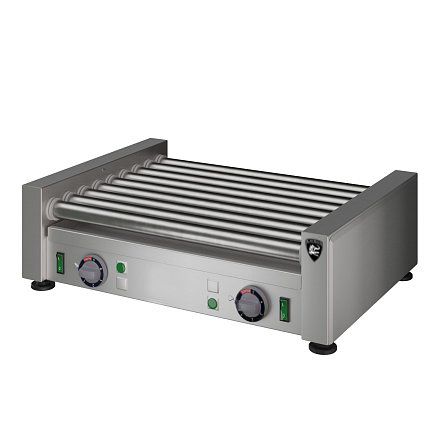 Заказ от 5шт. 536х402х170мм, 1,36 кВт, 220В, ролики из нержавеющей стали 9шт., длина ролика 450мм, кол-во одновременно приготавливаемых сосисок 8-24шт., время приготовления при полной загрузке около 8-14мин, время разогрева роликов до максимальной температуры 10 мин. Скорость вращения роликов 2 об/мин. Под роликами установлен поддон для сбора жира. Масса 13кг.