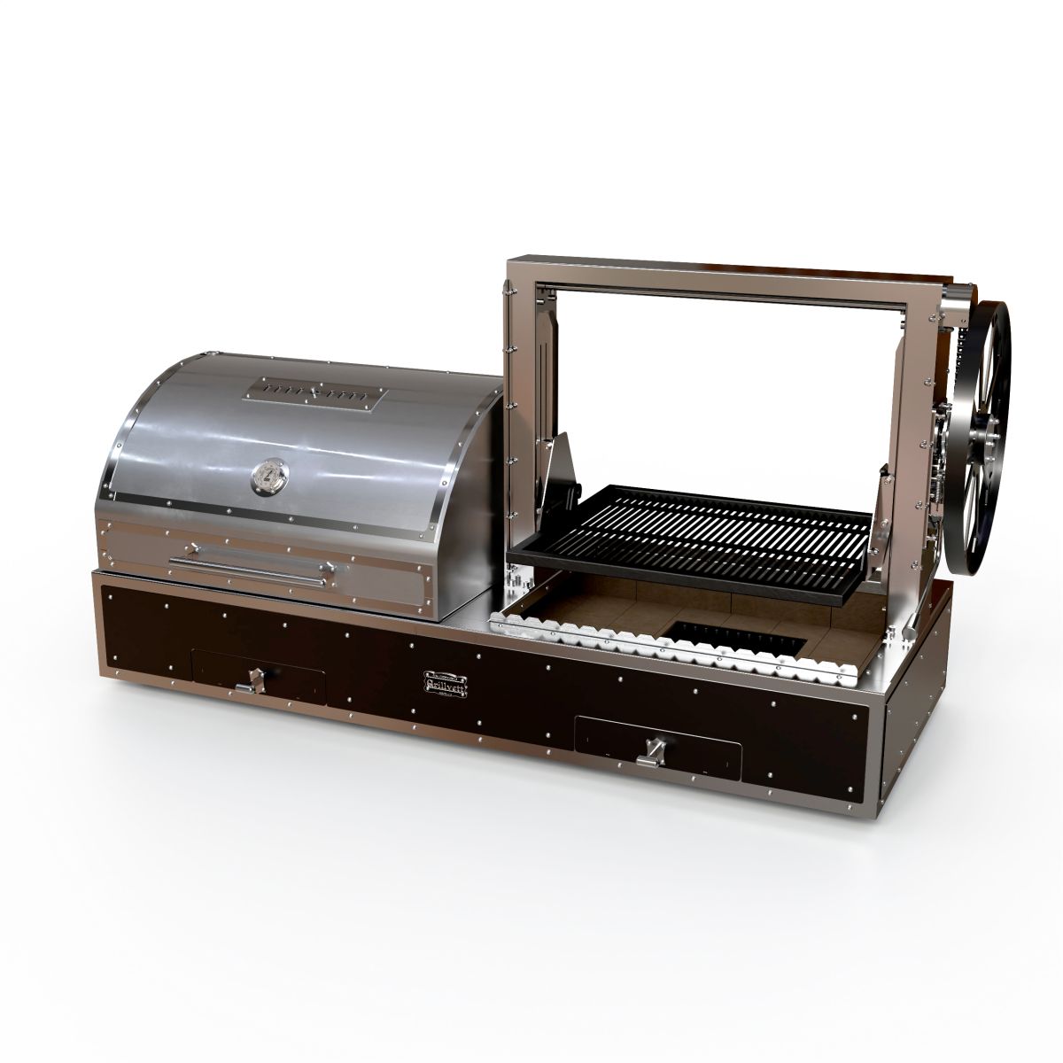 1880х720х950 мм, Многофункциональный угольный гриль Grillvett Corvette S — уникальный настольный гриль с широким функционалом в классическом исполнении, фурнитура из нержавеющей стали AISI 304, аналоговый термометр, регулировка поддува колосников, планки для шампуров, расход углей 20-25кг/смена