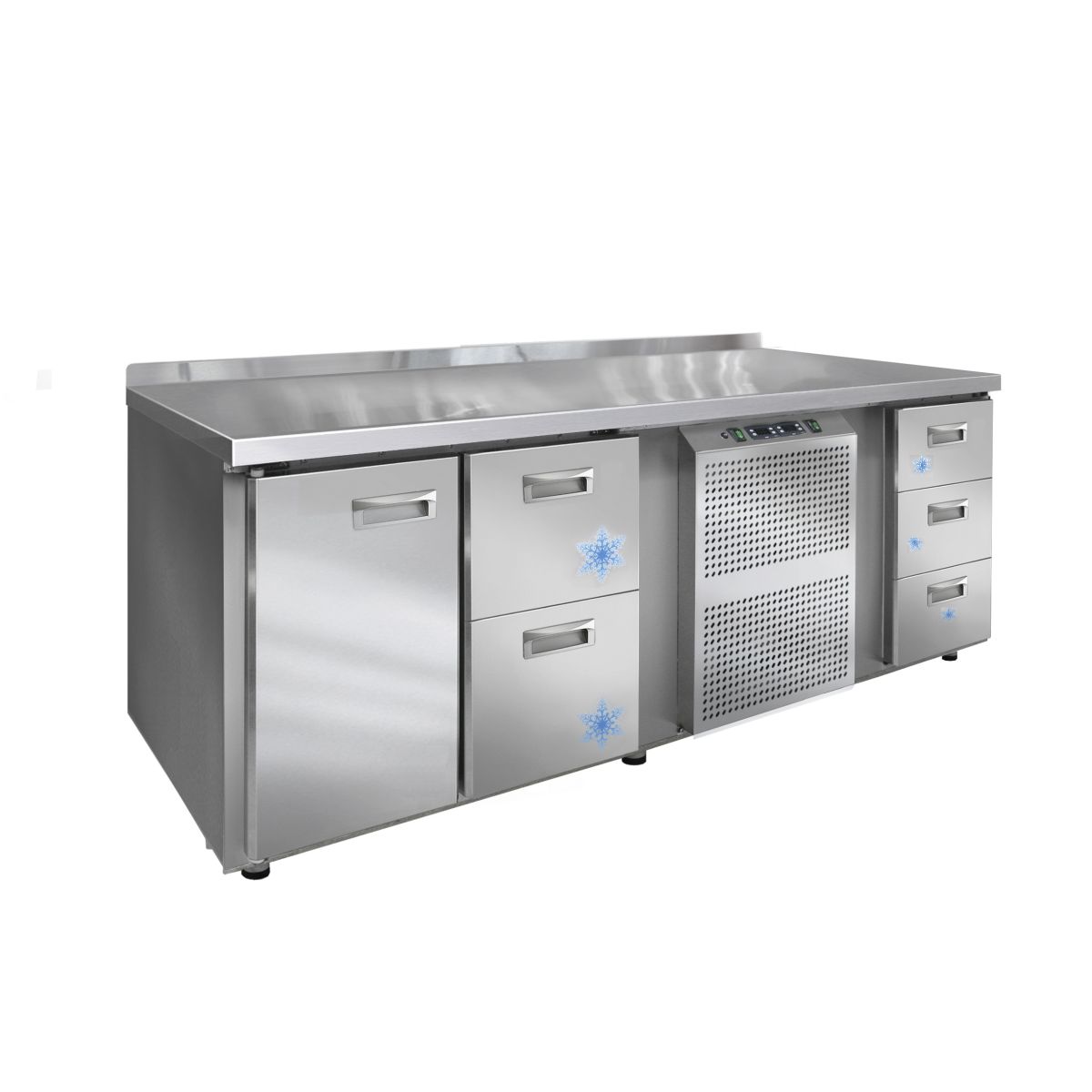 Комбинированные холодильные столы призваны в рамках ограниченного пространства кухни уместить холодильный и морозильный объём для хранения полуфабрикатов и заготовок. Конструкция комбинированного холодильного стола включает две рабочие камеры с независимым управлением для хранения продуктов. Одна создает температуру от -2◦С до +8◦С. Вторая – -10…-18◦С. На передней панели отделения для холодильного агрегата предусмотрена перфорация. Благодаря этому воздух свободно может циркулировать, что обеспечивает эффективное охлаждение компрессора. Двери оборудуются доводчиками. Технические характеристики: Температурный режим: камера 1: -2...+8,°С, камера 2: -10...-18°С Компрессор Aspera, Electrolux, l'unite hermetique Микропроцессорный блок управления Динамическое охлаждение Напряжение питания: 220В/50Гц Автоматическая оттаика испарителя Столы выполнены полностью из нержавеющей стали Цельнозаливной корпус Повышенная прочность столешницы холодильного стола