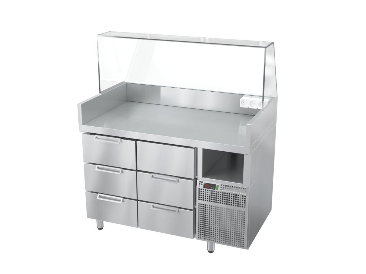 1235х750х1450(870*)мм, Подключаемая мощность 4,0 кВт, Мощность холодильного агрегата 0,4 кВт, 220 В, Температура охл. объема +2...+6 C, * - высота по столешнице