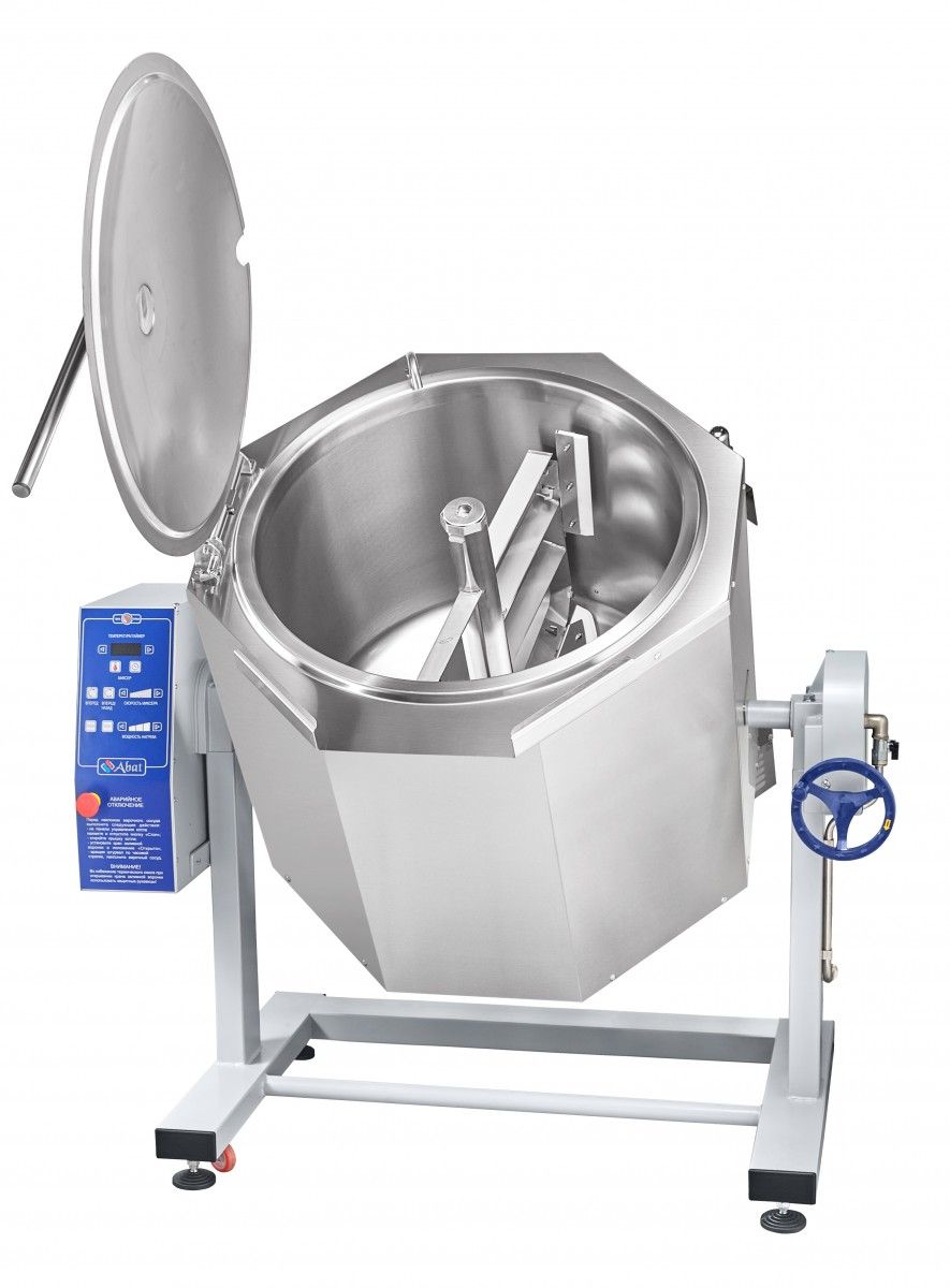 1310х918х1256мм, Котел пищеварочный электрический КПЭМ-100-ОМР-В, 100 л, миксер 0-120 об/мин (10 шагов, нижний привод, реверс), +125 С, пар. рубашка, ручное опрокидывание, цельнотянутый