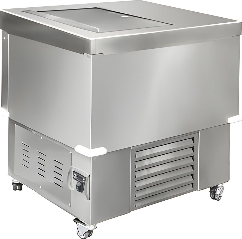 700х880х840(1350)мм, Ларь морозильный со сдвижной самозакрывающейся крышкой, угловыми защитными пластиковыми отбойниками, колесами, съёмной решеткой из нержавеющего прутка, задним коробом для корзин, дополнительным поддоном, из нержавеющей стали AISI 304, R404A, объём морозильной ванны 115л, температурный режим -18…-23*С (при tокр.среды до +35*С). Вольтаж: 220 V; Мощность: 500 Вт