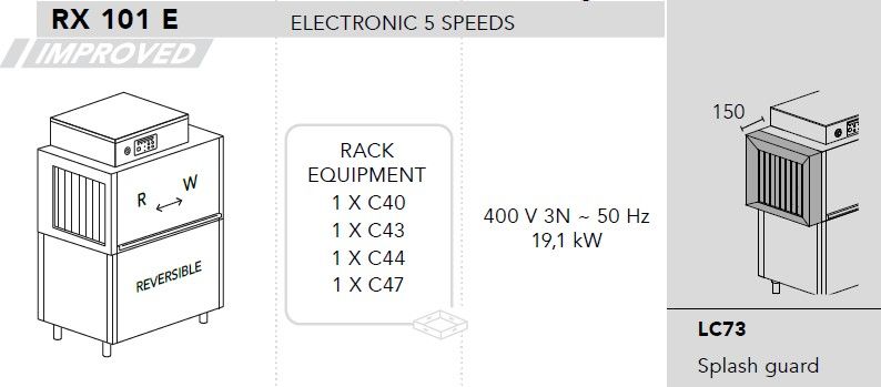 1380*715*1565/1900, 380В, 19.1кВт, 5 скоростей 70-100 кас/ч, до 1800 тар/ч, подключение к горячей воде, DDE - дозаторы моющ. и ополаск средства, 2LC73 - брызгозащита с двух сторон; корзины в комплекте: С40 для тарелок, C44 для бокалов, С43 для GN1/1, C47 для приборов, машина реверсивная, но изначально на заводе её настроят СЛЕВА-НАПРАВО
