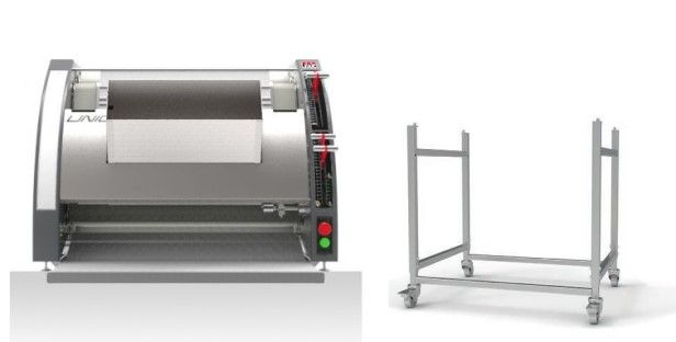 962*1082*708мм, 1,1кВт, 380В, 3 раскаточных валика из пищевого полиэтилентерефталата. Вес тестовых заготовок от 50 до 1200г. Стандартная подставка на колесиках в комлпекте