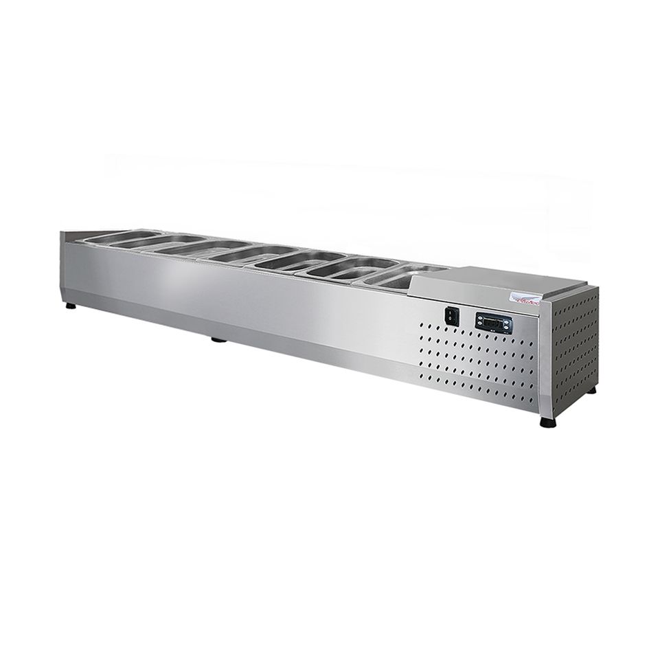 Холодильная настольная витрина ToppingBox открытая предназначена для демонстрации и кратковременного хранения подготовленных начинок/топпингов (для пиццы, блинов, лапши WOK), а также мясных изделий и полуфабрикатов на предприятиях быстрого питания и торговли. Пониженная температура позволяет в течение длительного времени сохранять вкусовые качества, внешний вид и структуру продуктов. Витрина оснащена статическим охлаждением. Технические характеристики: Температурный режим: +2...+7°С Микропроцессорный блок управления Компрессор: Aspera, ACC, Electrolux, l'unite, hermetique Мощность: 0,13кВт Потребление электроэнергии за сутки: до 1,04кВт/сут(зависит от условий эксплуатации) Статическое охлаждение Напряжение питания: 220В/50Гц Автоматическая оттайка испарителя Цельнозаливной корпус