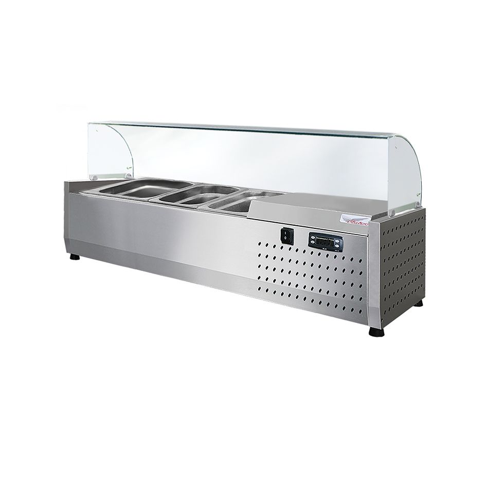 Холодильная настольная витрина ToppingBox с моллированным стеклом предназначена для демонстрации и кратковременного хранения подготовленных начинок/топпингов (для пиццы, блинов, лапши WOK), а также мясных изделий и полуфабрикатов на предприятиях быстрого питания и торговли. Пониженная температура позволяет в течение длительного времени сохранять вкусовые качества, внешний вид иструктуру продуктов. Молированное стекло предотвращает попадание в гастроемкости посторонних предметов. Холодильная витрина - хорошее дополнение к холодильному столу или блинной станции. Технические характеристики: Температурный режим: +2...+7°С Микропроцессорный блок управления Компрессор: Aspera, ACC, Electrolux, l'unite, hermetique Мощность: 0,13кВт Потребление электроэнергии за сутки: до 1,04кВт/сут(зависит от условий эксплуатации) Статическое охлаждение Напряжение питания: 220В/50Гц Автоматическая оттайка испарителя Цельнозаливной корпус