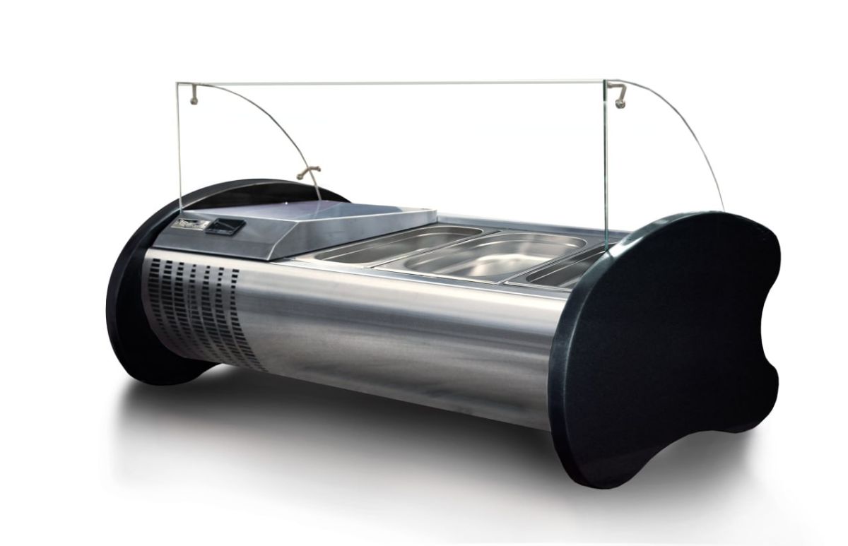 Холодильная настольная витрина ToppingBox с декоративными панелями и моллированным стеклом предназначена для демонстрации и кратковременного хранения подготовленных начинок/топпингов (для пиццы, блинов, лапши WOK), а также мясных изделий и полуфабрикатов на предприятиях быстрого питания и торговли. Пониженная температура позволяет в течение длительного времени сохранять вкусовые качества, внешний вид и структуру продуктов. Технические характеристики: Температурный режим: +2…+7°С Микропроцессорный блок управления Компрессор: Aspera, ACC, Electrolux, lunite, hermetique Мощность: 0,13кВт Потребление электроэнергии за сутки: до 1,04кВт/сут(зависит от условий эксплуатации) Статическое охлаждение Напряжение питания: 220В/50Гц Цельнозаливной корпус