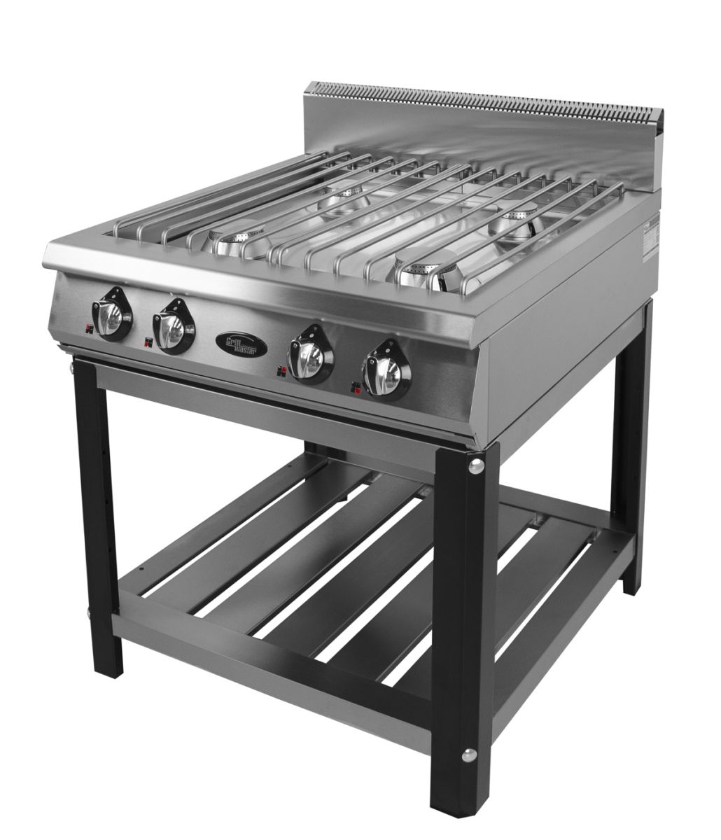800х900х1050мм, 900 линия, 4 профессиональные горелоки класса Heavy Duty -31 kW с запальной системой розжига, 2 горелки по 6,5 кВт, 2 по 9 кВт, уникальная решетка горелок из н/стали, запальный розжиг, газ-контроль всех горелок, разборный стенд с нейтральной полкой, настроена на метан (сопло на пропан в комплекте), г.нетто 800х900х1050, 120кг, г.брутто: 890х1000х650 мм, 145 кг . плита полностью из н/стали