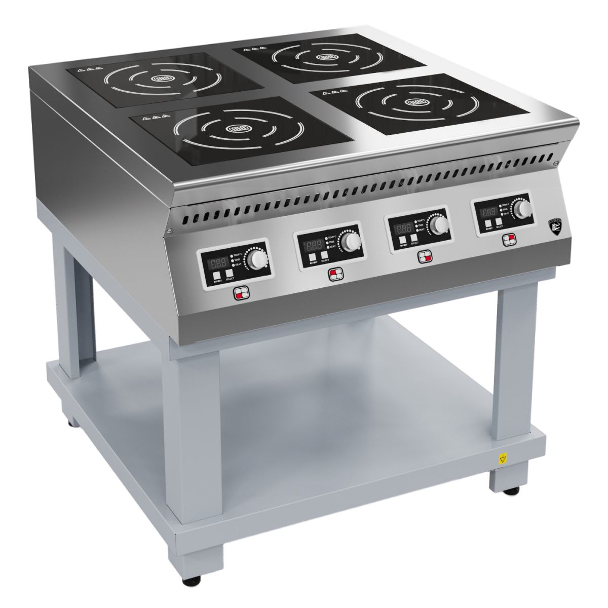 840х850х860/940мм, 4 конфорки, стеклокерамика 6 мм, 4 независимых индуктора мощностью 3,5кВт, 9 ур. Мощности ,+60..+240? С 14кВт , 400В, 900 серии, без воздуховода, на крашеной подставке;
