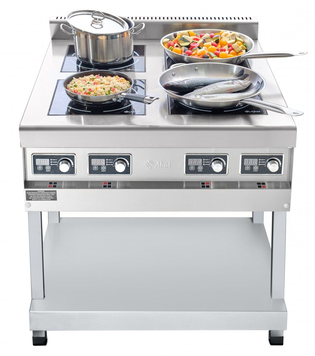 Плита индукционная 4-х конфорочная КИП-49П-5,0, краш. подставка, 840х900х940 мм, 9 ур. мощности, +60…+240 С, 20 кВт, 400 В, 4 независимых индуктора, стеклокерамика 6 мм, 2 жироулавливающих фильтра, защита от перегрева