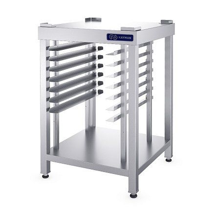 Габариты 600х600х960мм, вместимость GN-1/1 7шт., вместимость противней 600х400мм 7шт., материал столешницы, полки и направляющих AISI 304, материал стоек AISI 210. Разборная конструкция. Сплошная столешница позволяет установить любое технологическое оборудование. Стойки выполнены из трубы квадратного сечения 40х40 мм. В нижней части подставки имеется сплошная полка. Углы столешницы заварены и зачищены для обеспечения простоты санитарной обработки и уборки. В верхней части столешницы по углам установлены упоры, предотвращающие случайное падение оборудования во время его эксплуатации. На стойках расположены направляющие для установки гастроемкостей GN 1/1 и/или пекарских противней размером 600х400 мм. Опорные ножки подставки регулируются по высоте для компенсации неровностей пола. Вес 38кг.