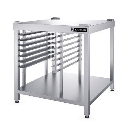Габариты 800х800х850мм, вместимость GN-1/1 7шт., вместимость противней 600х400мм 7шт., подходит для ПАРОКОНВЕКТОМАТ ЭЛЕКТРИЧЕСКИЙ KAYMAN, материал столешницы, полки и направляющих AISI 304, материал стоек AISI 210. Разборная конструкция. Сплошная столешница позволяет установить любое технологическое оборудование. Стойки выполнены из трубы квадратного сечения 40х40 мм. В нижней части подставки имеется сплошная полка. Углы столешницы заварены и зачищены для обеспечения простоты санитарной обработки и уборки. В верхней части столешницы по углам установлены упоры, предотвращающие случайное падение оборудования во время его эксплуатации. На стойках расположены направляющие для установки гастроемкостей GN 1/1 и/или пекарских противней размером 600х400 мм. Опорные ножки подставки регулируются по высоте для компенсации неровностей пола. Вес 47,5кг.