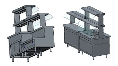 1070х367х400мм, 1 уровень (нижний): полка из нержавеющей стали, с обогревом и с освещением, с удлиненной стеклянной защитой со стороны клиента, 2 уровень (верхний): полка из нержавеющей стали, с обогревом и с освещением, с классической стеклянной защитой со стороны клиента