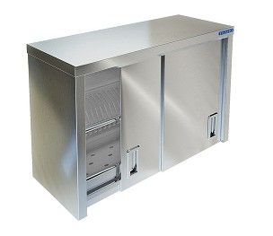 910х360х600мм, Полка-шкаф настенная для сушки посуды сварная из нержавеющей стали марки AISI 430 толщиной 0,8мм, двери-купе, на 35 тарелок и 50 стаканов, поддон из нержавеющей стали марки AISI 430 толщиной 0,8мм, полка-кассета формованная под тарелки из нержавеющей стали марки AISI 430 толщиной 0,8мм, съемная. Задняя стенка нержавеющая сталь марки AISI 430 толщиной 0,8мм. Имеет накладки с вырезом "замочная скважина" для крепления к стене. Полка поставляется в собранном виде.