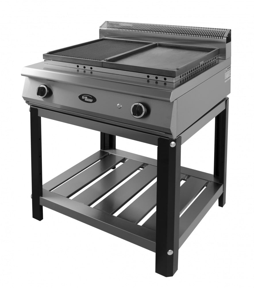 800x800x1050мм, 2 специальные горелки с запальной системой розжига, газовая мощность 23 kW, чугунная рабочая поверхность, 1/2 рифленая, 1/2 гладкая, электророзжиг, газ/контроль,настроена на метан (сопло на пропан в комплекте), г.нетто 800x800x1050, 94 кг, г.брутто:860х860х610, 99 кг.