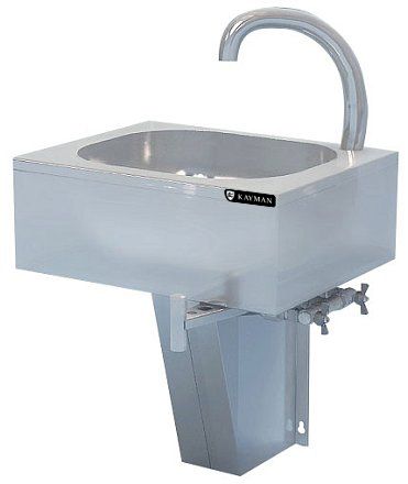 Габариты 500х500х600мм, габариты мойки 400х500х120мм, диаметр сливного отверстия 48мм, высота пристенного борта 20мм, отверстие под смеситель, материал рукомойника AISI 430 0,8мм, имеет борт с пристенной стороны и смеситель, вес 10,2мм. Подача воды осуществляется с помощью поворотного механизма для регулирования напора воды, который расположен под раковиной. Механизм может приводиться в действие бедром работника, обеспечивая быструю подачу воды. В комплект поставки входит крепеж для стены, сливным сифоном с гидрозатвором.Рукомойник размещается на стене с подключением к водопроводной сети и канализации. Смеситель в комплект не входит.