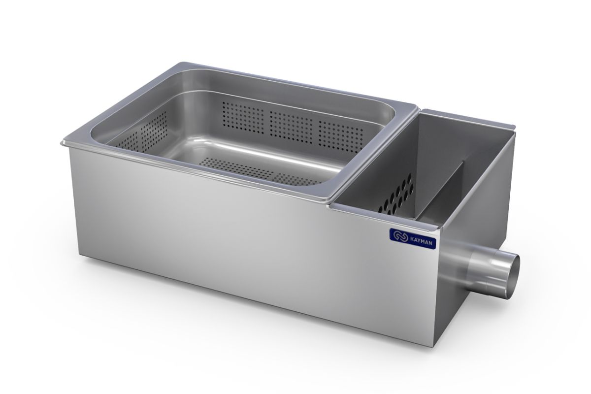 483х272х157мм, каркас AISI430 0,8мм, масса 3, 5кг. Мезгосборник предназначен для предотвращения попадания отходов (мезги) в сточную канализацию при очистке овощей на картофелечистке KAYMAN. В корпус установлена перфорированная гастроемкость GN-1/2 H100 мм, которая задерживает мезгу. Специальный вкладыш, установленный у выходного патрубка мезгосборника, обеспечивает осаждение тяжелых частиц (песка, камней и пр.), исключая их попадание в канализацию. Мезгосборник устанавливается под сливной рукав картофелечистки. При этом рекомендуется сливной рукав укоротить на длину, удобную для слива отходов.