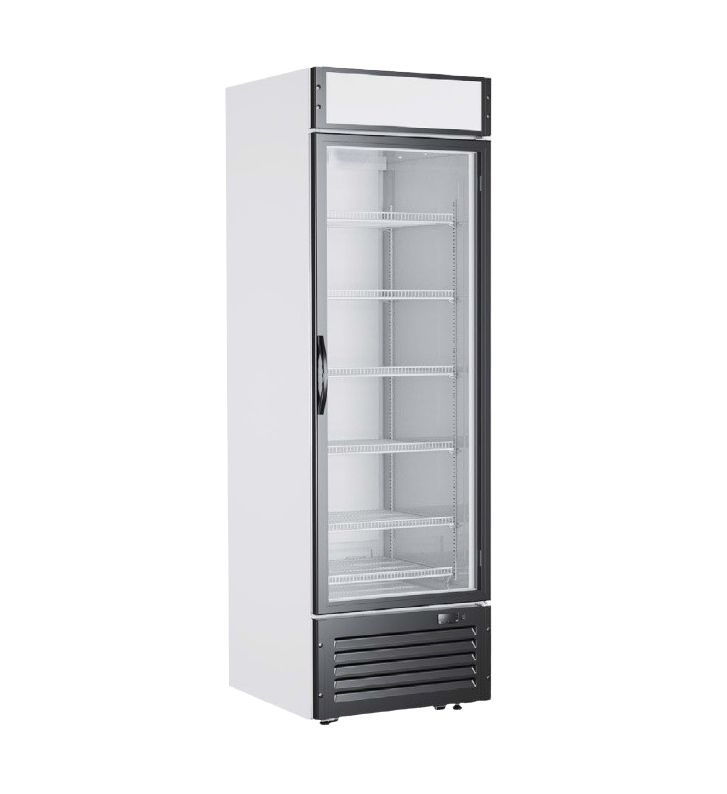 635x730x2090 мм.; -18...-24С; стеклянная дверь;агрегат снизу; динамическое охлаждение,220 В; 500 литров.Корректированный уровень звуковой мощности, дБА, не более 59. Размер вставки под рекламу в верхней части холодильника 577х187мм.В комплекте 6 полок.