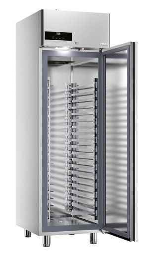 620x800x2040мм, 0,68 кВт, 220В, -22...-15C, контроль отн. влажности в пределах 75%...90%, вент. (динамическое) охлаждение, для кондитерских изделий, функция Hyper Cold, 1 глухая дверь, общий объем 521 л. полезный объем 352 л., нерж.сталь, R290. Выносной агрегат. 20 пар направляющих из нерж . стали под противни EN60x40 (600*400мм)