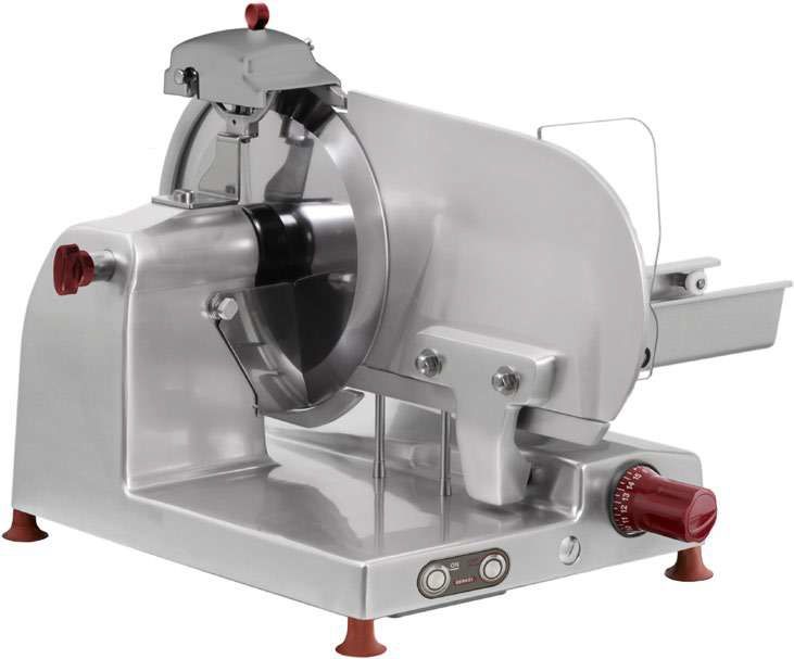 Диаметр ножа 350 мм, Передача редукторная, ручной вертикальный слайсер для нарезки мяса. Толщина нарезки 0-25 мм. Слайсер для профессионального использования на закрытых кухнях ресторанов. Детали из алюминия и нержавеющей стали, корпус из анодированного алюминия с пластиковыми деталями. Встроенное заточное устройство. Специальная конструкция для легкости очистки и точной нарезки.