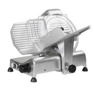 Габариты 425 x 400 x H 355 мм. Диаметр ножа 220 мм, рез 215x130 мм. Полуавтоматический слайсер для нарезки мяса, сыра, колбасных изделий и других продуктов питания. Толщина нарезки 0-14?16 мм. Слайсер для профессионального использования на предприятиях общественного питания. Нож из хромированной стали, корпус из лакированного алюминия с пластиковыми деталями. Фиксированное заточное устройство.