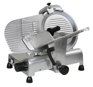 Габариты 570 x 480 x H 420 мм. Диаметр ножа 300 мм, рез 245x195 мм. Полуавтоматический слайсер для нарезки мяса, сыра, колбасных изделий и других продуктов питания. Толщина нарезки 0-15 мм. Слайсер для профессионального использования на предприятиях общественного питания. Нож из хромированной стали, корпус из лакированного алюминия с пластиковыми деталями. Фиксированное заточное устройство. Версия DOM