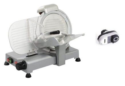 Габариты 530 x 442 x H 345 мм. Версия PROF. Диаметр ножа 250 мм, рез 230x185 мм. Полуавтоматический слайсер для нарезки мяса, сыра, колбасных изделий и других продуктов питания. Толщина нарезки 0-14?16 мм. Покрытие ножа - тефлон. Слайсер для профессионального использования на предприятиях общественного питания. Нож из хромированной стали, корпус из лакированного алюминия с пластиковыми деталями. Фиксированное заточное устройство.
