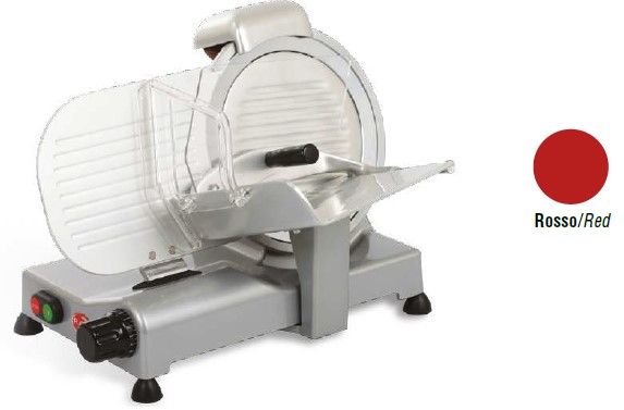 Габариты 530 x 442 x 375 мм. Версия DOM. Диаметр ножа 250 мм, рез 230x165 мм. Cлайсер для нарезки мяса, сыра, колбасных изделий и других продуктов питания. Толщина нарезки 0-14?16 мм. Слайсер для профессионального использования на предприятиях общественного питания. Нож из хромированной стали, корпус из лакированного алюминия с пластиковыми деталями. Фиксированное заточное устройство. Версия в красном цвете.