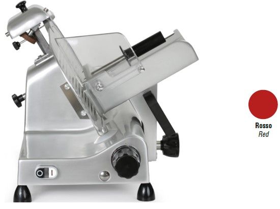 Габариты 605 x 480 x H 420 мм. Диаметр ножа 300 мм, рез 245x195 мм. Профессиональный слайсер для нарезки мяса, сыра, колбасных изделий и других продуктов питания. Толщина нарезки 0-14?16 мм. Слайсер для профессионального использования на предприятиях общественного питания. Нож из хромированной стали, корпус из лакированного алюминия с пластиковыми деталями. Фиксированное заточное устройство. Версия PROF, цвет красный (red)