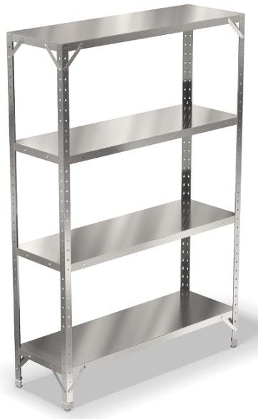 900х500х1800мм, Стеллаж, 4 сплошные полки из нержавеющей стали AISI 430 толщиной 0,5 мм с усилителем. Расстояние между полками регулируемое с шагом 50мм.. Каркас из уголка оцинкованной стали толщиной 1,5 мм. Распределенная статическая нагрузка на полку - 50 кг. Наличие подгибов по периметру полки исключает опасность травм.
