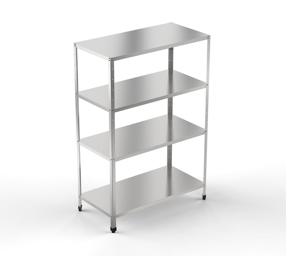 1200х500х1800мм, Стеллаж кухонный, 4 сплошные полки выполненные из нерж. стали марки AISI 430, толщина 0,8 мм; каркас разборный - уголок из стали AISI 430, 1,5мм- толщиной.