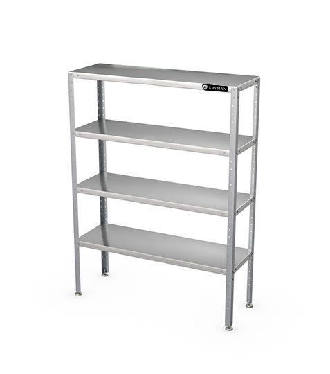 600х500х1800мм, нагрузка на полку 20кг. Материал полок AISI 430 0,8мм, материал стоек AISI 430 1,2мм, профиль стоек 1,2мм уголок 40х40мм. Регулировка ножек 20мм. Шаг размещения полок 50мм. Вес 23,5кг. Все кромки полок и элементов стоек имеют подгиб (фальцовку). Под полкой размещен дополнительный швеллер-усилитель. Опорные ножки имеют пластиковое основание. Изделия разборные и поставляются в удобной упаковке.