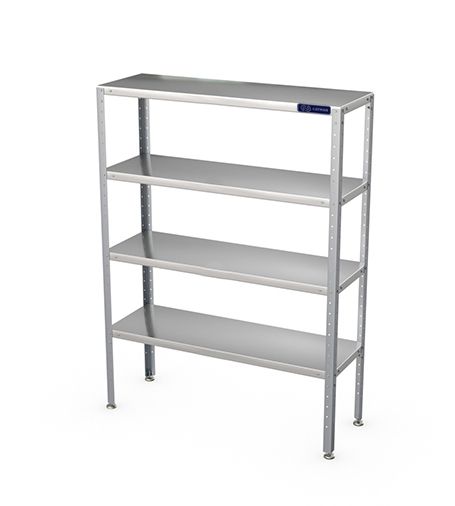 800х400х1800мм, нагрузка на полку 20кг. Материал полок AISI 430 0,8мм, материал стоек оцинкованная сталь 1,2мм, профиль стоек 1,2мм уголок 40х40мм. Регулировка ножек 20мм. Шаг размещения полок 50мм. Вес 29,6кг. Все кромки полок и элементов стоек имеют подгиб (фальцовку). Под полкой размещен дополнительный швеллер-усилитель. Опорные ножки имеют пластиковое основание. Изделия разборные и поставляются в удобной упаковке.