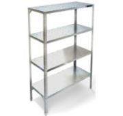 1200х300х1830,каркас разборный, стойки из оцинкованного уголка 40х40 из, толщиной 1,5 мм, 4 перфорированные полки из стали AISI 430, толщиной 0,8 мм, , 0,07V, м3 Нагрузка на одну полку- 70 кг- равнораспределенная. Дополнительные укосины для жесткости конструкции