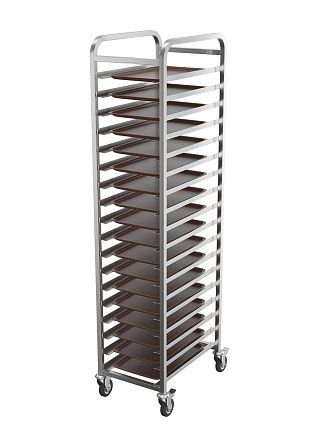 415х600х1900мм, количество уровней 18, для подносов 350х600мм, расстояние между уровнями 90, максимальная распределенная нагрузка общая 160кг, максимальная распределенная нагрузка на одну полку 10кг, материал направляющих AISI 304, они имеют концевые отгибы, обеспечивающие фиксацию противней и предотвращающие их выпадение при движении шпильки. Профиль стоек AISI 304 труба 25х25мм, материал стоек нерж. сталь 1,5мм. Колесная опора без тормозов 2шт., колесная опора с тормозом 2шт. Диаметр поворотных колес 100мм. Вес 27кг.