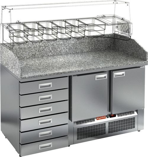 1525х700х850мм, PZE4-11/GN КАМЕНЬ стол для пиццы охл. (-2+10), 2 двери, с бортом с 3х сторон, с нейтральным модулем 6 ящ. слева, 1525х700х850мм, HICOLD RUS