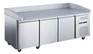 2020x800x1000 мм, 230В, 0,32 кВт, 580 л, -2…+8 C, каменная столешница с 3 бортами, 3 двери, полки 600х400, одна полка для каждой двери в комплекте, боковое расположение холодильного агрегата, динамическое охлаждение, на колесах