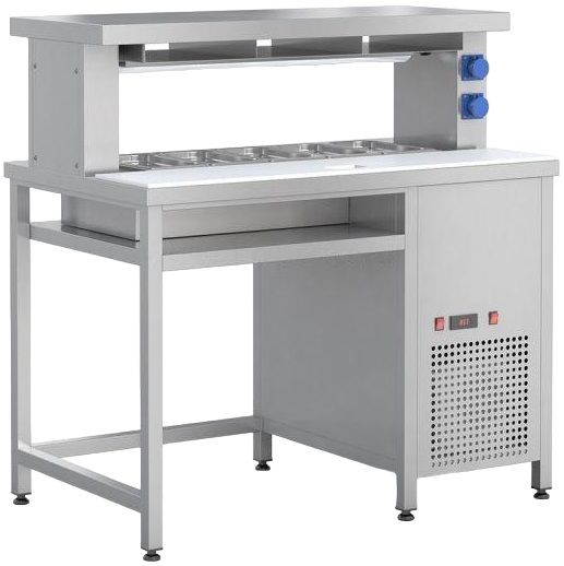 1250х700х1280мм, Стол фасовочный пристенный с охлаждаемой ванной на 5 GN1/3 глубиной 100 мм и тепловой поверхностью, подсветка, направляющие. Гастроемкости в комплект не входят.