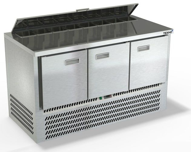 1485х700х850мм, Охлаждаемый стол без борта для салатов, с крышкой, нижнее расположение агрегата. Столешница и корпус из нержавеющей стали марки AISI 430. Задняя панель и дно из оцинкованной стали. 3 двери. Температурный режим +2...+10, напряжение 220В, мощность 220Вт, внутренний объем стола 340л, в зону под гастроёмкости помещается 7 GN 1/6 глубиной 150мм, полезный объём стола 210л. Компрессор (Испания). Хладон R-134. Петля доводчик (Польша). Полка решетка регулируемая по высоте с шагом - 45мм, гастронормированная, нагрузка 35кг. Нога опорная, регулировка 25мм. Поставляется в собранном виде.